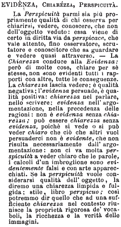 | Evidenza, Chiarezza, Perspicuità - La perspicuità parmi sia più propriamente qualità di chi osserva per chiarirsi, vedere, conoscere, che non dell'oggetto veduto: essa viene di certo in dritta via da perspicace, che vale attento, fino osservatore, scrutatore e conoscitore. La chiarezza conduce alla evidenza: però di molte cose, chiare per se stesse, non sono evidenti tutti i rapporti con altre, tutte le conseguenze. La chiarezza lascia vedere; è qualità negativa; l'evidenza persuade; è qualità positiva; chiarezza nel parlare, nello scrivere; evidenza nell'argomentazione, nella figliazione delle ragioni: non è evidenza senza chiarezza; può essere chiarezza senza evidenza, poichè si vede o si può veder chiaro che ciò che altri vuol persuaderci non è evidente, che non risulta necessariamente dell'argomentazione: non ci va molta perspicuità a veder chiaro che le parole, i calcoli d'un imbroglione sono evidentemente falsi e con arte apparecchiati. Se la perspicuità vuole considerarsi qualità dell'oggetto, la diremo una chiarezza limpida e fulgida; stile, libro perspicuo; così potremo dir quello che ad una sufficiente chiarezza nel contesto riunisce la proprietà rigorosa de' vocaboli, la ricchezza e la verità delle immagini. [immagine] |