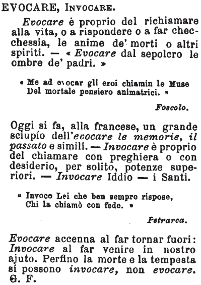 “Me ad evocar gli eroi chiamin le Muse Del mortale pensiero animatrici.” Foscolo. Oggi si fa, alla francese, un grande sciupío dell’evocare le memorie, il passato e simili. - Invocare è proprio del chiamare con preghiera o con desiderio, per solito, potenze superiori. - Invocare Iddio – i Santi. “Invoco Lei che ben sempre rispose, Chi la chiamò con fede.” Petrarca. Evocare accenna al far tornar fuori: Invocare al far venire in nostro ajuto. Perfino la morte e la tempesta si possono invocare, non evocare. G. F. [immagine] |