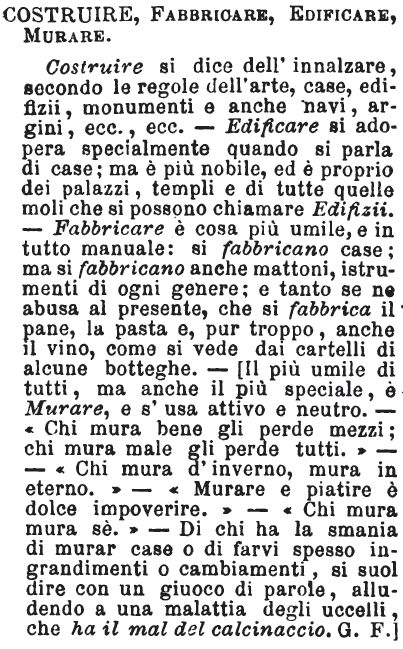 | Costruire, Fabbricare, Edificare, Murare - Costruire si dice dell'innalzare, secondo le regole dell'arte, case, edifizii, monumenti e anche navi, argini, ecc., ecc. - Edificare si adopera specialmente quando si parla di case; ma è più nobile, ed è proprio dei palazzi, templi e di tutte quelle moli che si possono chiamare Edifizii. - Fabbricare è cosa più umile, e in tutto manuale: si fabbricano case; ma si fabbricano anche mattoni, istrumenti di ogni genere; e tanto se ne abusa al presente, che si fabbrica il pane, la pasta e, pur troppo, anche il vino, come si vede dai cartelli di alcune botteghe. - [Il più umile di tutti, ma anche il più speciale, è Murare, e s'usa attivo e neutro. - «Chi mura bene gli perde mezzi; chi mura male gli perde tutti.» - «Chi mura d'inverno, mura in eterno.» - «Murare e piatire è dolce impoverire.» - «Chi mura mura sè.» - Di chi ha la smania di murar case o di farvi spesso ingrandimenti o cambiamenti, si suol dire con un giuoco di parole, alludendo a una malattia degli uccelli, che ha il mal del calcinaccio. G. F.] [immagine] |