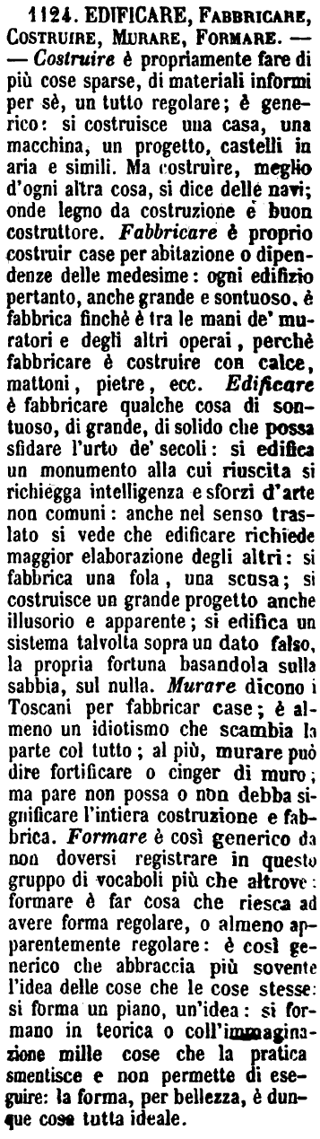 | Edificare, Fabbricare, Costruire, Murare, Formare - Costruire è propriamente fare di più cose sparse, di materiali informi per sè, un tutto regolare; è generico: si costruisce una casa, una macchina, un progetto, castelli in aria e simili. Ma costruire, meglio d'ogni altra cosa, si dice delle navi; onde legno da costruzione e buon costruttore. Fabbricare è proprio costruir case per abitazione o dipendenze delle medesime: ogni edifizio pertanto, anche grande e sontuoso, è fabbrica finchè è tra le mani de' muratori e degli altri operai, perchè fabbricare è costruire con calce, mattoni, pietre, ecc. Edificare è fabbricare qualche cosa di sontuoso, di grande, di solido che possa sfidare l'urto de' secoli: si edifica un monumento alla cui riuscita si richiegga intelligenza e sforzi d'arte non comuni: anche nel senso traslato si vede che edificare richiede maggior elaborazione degli altri: si fabbrica una fola, una scusa; si costruisce un grande progetto anche illusorio e apparente; si edifica un sistema talvolta sopra un dato falso, la propria fortuna basandola sulla sabbia, sul nulla. Murare dicono i Toscani per fabbricar case; è almeno un idiotismo che scambia la parte col tutto; al più murare può dire fortificare o cinger di muro; ma pare non possa o non debba significare l'intiera costruzione e fabbrica. Formare è così generico da non doversi registrare in questo gruppo di vocaboli più che altrove: formare è far cosa che riesca ad avere forma regolare, o almeno apparentemente regolare: è così generico che abbraccia più sovente l'idea delle cose che le cose stesse: si forma un piano, un'idea: si formano in teorica o coll'immaginazione mille cose che la pratica smentisce e non permette di eseguire: la forma, per bellezza, è dunque cosa tutta ideale. [immagine] |
