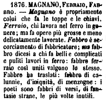 | Fabbro, Magnano - Fabbro è colui che lavora il ferro in generale, o alla fucina, o battendolo, o altrimenti. - Magnano è colui che specialmente fa e racconcia chiavi, toppe e altre serrature. [immagine] |