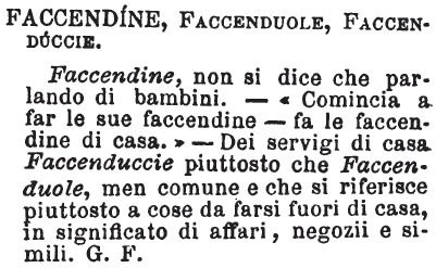 | Faccendine, Faccenduole, Faccenduccie - Faccendine, non si dice che parlando di bambini. - «Comincia a far le sue faccendine - fa le faccendine di casa.» - Dei servigi di casa Faccenduccie piuttosto che Faccenduole, men comune e che si riferisce piuttosto a cose da farsi fuori di casa, in significato di affari, negozii e simili. G. F. [immagine] |