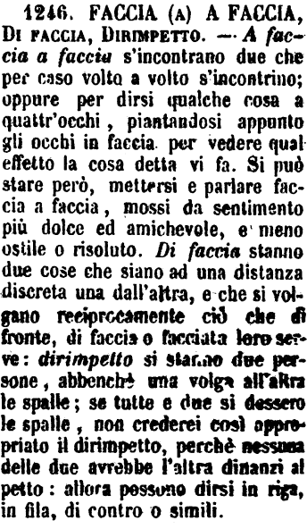 | Faccia (a) a faccia, Alla presenza, Di faccia, Dirimpetto, A faccia, A viso - A faccia a faccia si dice di due persone che si trovano l'una dirimpetto all'altra e molto vicine. - Alla presenza non è reciproco, ma vale l'essere una persona dinanzi ad un'altra, o per chieder qualcosa o per dir sue ragioni o per fare checchessia. - Di faccia si suol dire di cosa materiale che sia dinanzi ad un'altra di simile qualità e che abbia larga superficie. - «Sta nella casa di faccia alla mia.» - Dirimpetto vale lo stesso, ma si dice di qualunque cosa, e forse accenna distanza minore. - A faccia e A viso valgono l'istesso, salvo che A faccia è più efficace, ed è usitato specialmente dove si parli di cose da dirsi o da confermarsi senza riguardi e senza paura. - «Io l'ho detto lui, e glielo mantengo a faccia. - Io glielo dico a viso: questa cosa non istà bene.» [immagine] |