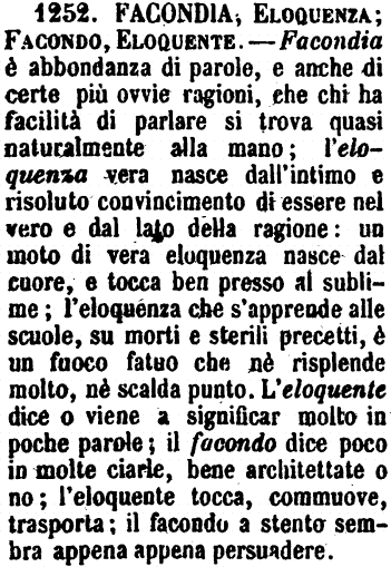 | Facondia, Eloquenza; Facondo, Eloquente - Facondia è abbondanza di parole, e anche di certe più ovvie ragioni, che chi ha facilità di parlare si trova quasi naturalmente alla mano; l'eloquenza vera nasce dall'intimo e risoluto convincimento di essere nel vero e dal lato della ragione: un moto di vera eloquenza nasce dal cuore, e tocca ben presso al sublime; l'eloquenza che s'apprende alle scuole, su morti e sterili precetti, è un fuoco fatuo che nè risplende molto, nè scalda punto. L'eloquente dice o viene a significar molto in poche parole; il facondo dice poco in molte ciarle, bene architettate o no; l'eloquente tocca, commuove, trasporta; il facondo a stento sembra appena appena persuadere. [immagine] |