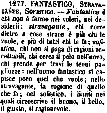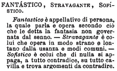 | Fantastico, Stravagante, Sofistico - Fantastico è appellativo di persona, la quale parla e opera secondo ciò che le detta la fantasia non governata dal senno. - Stravagante è colui che opera in modo strano e lontano dalla usanza e modi comuni. - Sofistico è colui che di nulla si appaga, a tutto contradice, su tutto cavilla e trova argomenti da contradire. [immagine] |