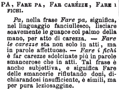 | Pa, Fare pa, Far carezze, Fare i fichi - Pa, nella frase Fare pa, significa, nel linguaggio fanciullesco, lisciare soavemente le guance col palmo della mano, per atto di carezza. - Fare le carezze sta non solo in atti, ma in parole affettuose. - Fare i fichi è far carezze sdolcinate più in parole smancerose che in atti. Tal frase è anche subjettiva, e significa Fare delle smancerie rifiutando doni, dichiarandosi insufficiente, è simili, ma per pura leziosaggine. [immagine] |