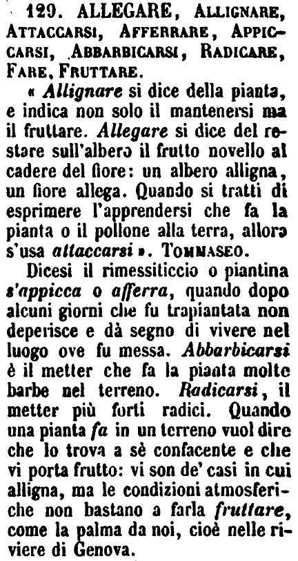 Allegare, Allignare, Attaccarsi, Afferrare, Appiccarsi, Abbarbicarsi, Radicare, Fare, Fruttare - «Allignare si dice della pianta, e indica non solo il mantenersi ma il fruttare. Allegare si dice del restare sull'albero il frutto novello al cadere del fiore: un albero alligna, un fiore allega. Quando si tratti di esprimere l'apprendersi che fa la pianta o il pollone alla terra, allora s'usa attaccarsi». Tommaseo.