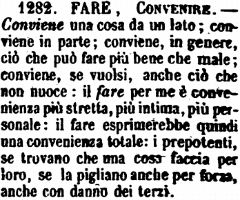 | Fare, Convenire - Conviene una cosa da un lato; conviene in parte; conviene, in genere, ciò che può fare più bene che male; conviene, se vuolsi, anche ciò che non nuoce: il fare per me è convenienza più stretta, più intima, più personale: il fare esprimerebbe quindi una convenienza totale: i prepotenti, se trovano che una cosa faccia per loro, se la pigliano anche per forza, anche con danno dei terzi. [immagine] |