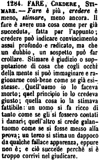 | Fare, Chiedere, Stimare - Fare è più, credere è meno, stimare, meno ancora. Il fare è avere una cosa come per già succeduta, fatta per l'appunto; credere può indicare convincimento assai profondo e radicato, ma che un dubbio, un sospetto può far crollare. Stimare è giudizio o supputazione di cosa che cogli occhi della mente si può immaginare e ragionarne così bene come se già esistesse. Quell'uomo io lo faceva morto; quel principio io lo credeva giusto; quella cosa io la stimava fattibile: un uomo si fa ricco di tanto come se gli si fossero contati i danari; quell'altro si crede galantuomo come se si fosse messo alla prova; un terzo si stima un dappoco da qualche fallace apparenza, eppure non è; e ciò succede perchè si è troppo corrivi nel giudicare. [immagine] |