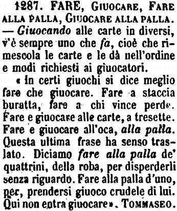 « In certi giuochi si dice meglio fare che giuocare. Fare a staccia buratta, fare a chi vince perde. Fare e giuocare alle carte, a tresette. Fare e giuocare all'oca, alla palla. Questa ultima frase ha senso traslato. Diciamo fare alla palla de' quattrini, della roba, per disperderli senza riguardo. Fare alla palla d'uno, per, prendersi giuoco crudele di lui. Qui non entra giuocare ». Tommaseo. [immagine] |