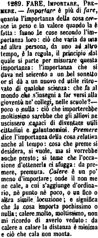 | Fare, Importare, Premere - Importare è più di fare, quanto l'importanza della cosa cresce in peso e in valore quando la è fatta: fanno le cose secondo l'importanza loro: ciò che varia da una ad altra persona, da uno ad altro tempo, è la regola, il principio dal quale si parte per misurare questa importanza: l'importanza che si dava nel seicento a un bel sonetto or si dà a un nuovo ed utile ritrovato di qualche scienza: che fa al mondo che s'insegni a far versi alla gioventù ne' collegi, nelle scuole? - poco o nulla: ciò che importerebbe moltissimo sarebbe che gli allievi ne uscissero capaci di diventare utili cittadini e galantuomini. Premere dice l'importanza della cosa relativa anche al tempo: cosa che preme si desidera, si vuole, ma si vorrebbe anche presto; si teme che l'occasione d'ottenerla ci sfugga: da premere, premura. Calere è un po' meno d'importare; onde il non me ne cale, a cui s'aggiunge d'ordinario, nè punto nè poco, o un fico o altra simile locuzione; e significa che la cosa importa pochissimo o nulla; calere molto, moltissimo, non mi ricordo di averlo veduto: da calere a calare la distanza è minima e ciò che cala non monta. [immagine] |