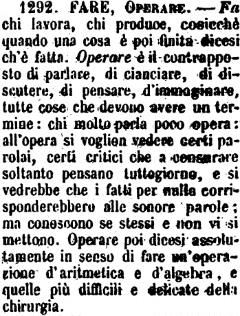 | Fare, Operare - Fa chi lavora, chi produce, cosicchè quando una cosa è poi finita dicesi ch'è fatta. Operare è il contrapposto di parlare, di cianciare, di discutere, di pensare, d'immaginare, tutte cose che devono avere un termine: chi molto parla poco opera: all'opera si voglion vedere certi parolai, certi critici che a censurare soltanto pensano tuttogiorno, e si vedrebbe che i fatti per nulla corrisponderebbero alle sonore parole; ma conoscono se stessi e non vi si mettono. Operare poi dicesi assolutamente in senso di fare un'operazione d'aritmetica e d'algebra, e quelle più difficili e delicate della chirurgia. [immagine] |