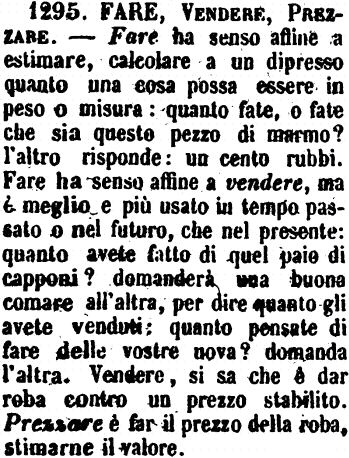 | Fare, Vendere, Prezzare - Fare ha senso affine a estimare, calcolare a un dipresso quanto una cosa possa essere in peso o misura: quanto fate, o fate che sia questo pezzo di marmo? l'altro risponde: un cento rubbi. Fare ha senso affine a vendere, ma è meglio e più usato in tempo passato o nel futuro, che nel presente: quanto avete fatto di quel paio di capponi? domanderà una buona comare all'altra, per dire quanto gli avete venduti; quanto pensate di fare delle vostre uova? domanda l'altra. Vendere, si sa che è dar roba contro un prezzo stabilito. Prezzare è far il prezzo della roba, stimarne il valore. [immagine] |