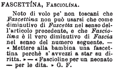 | Fascettina, Fasciolina - Noto di volo pe' non toscani che Fascettina non può usarsi che come diminutivo di Fascetta nel senso dell'articolo precedente, e che Fasciolina è il vero diminutivo di Fascia nel senso del numero seguente. - «Mettere alla bambina una fascettina perchè s'avvezzi a star su diritta.» - «Fascioline per un neonato - per le dita.» G. F. [immagine] |