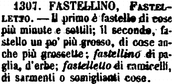 | Fastellino, Fastelletto - Il primo è fastello di cose più minute e sottili; il secondo, fastello un po' più grosso, di cose anche più grossette; fastellino di paglia, d'erbe; fastelletto di ramicelli, di sarmenti o somiglianti cose. [immagine] |
