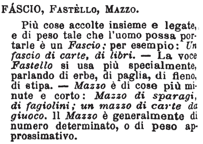 | Fascio, Fastello, Mazzo - Più cose accolte insieme e legate, e di peso tale che l'uomo possa portarle è un Fascio; per esempio: Un fascio di carte, di libri. - La voce Fastello si usa più specialmente, parlando di erbe, di paglia, di fieno, di stipa. - Mazzo è di cose più minute e corto: Mazzo di sparagi, di fagiolini; un mazzo di carte da giuoco. Il Mazzo è generalmente di numero determinato, o di peso approssimativo. [immagine] |
