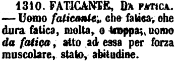 | Faticante, Da fatica - Uomo faticante, che fatica, che dura fatica, molta, o troppa; uomo da fatica, atto ad essa per forza muscolare, stato, abitudine. [immagine] |
