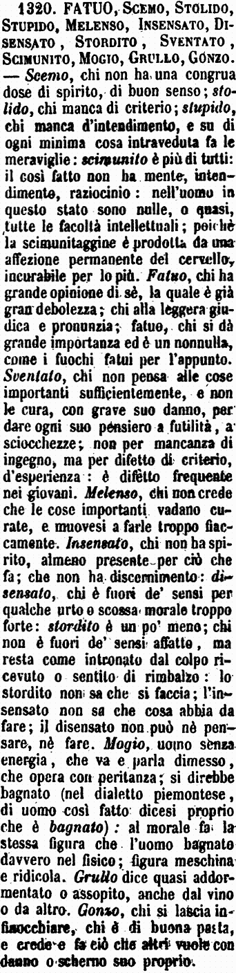 | Fatuo, Scemo, Stolido, Stupido, Melenso, Insensato, Disensato, Stordito, Sventato, Scimunito, Mogio, Grullo, Gonzo - Scemo, chi non ha una congrua dose di spirito, di buon senso; stolido, chi manca di criterio; stupido, chi manca d'intendimento, e su di ogni minima cosa intraveduta fa le meraviglie: scimunito è più di tutti: il così fatto non ha mente, intendimento, raziocinio: nell'uomo in questo stato sono nulle, o quasi, tutte le facoltà intellettuali; poichè la scimunitaggine è prodotta da una affezione permanente del cervello, incurabile per lo più. Fatuo, chi ha grande opinione di sè, la quale è già gran debolezza; chi alla leggera giudica e pronunzia; fatuo, chi si dà grande importanza ed è un nonnulla, come i fuochi fatui per l'appunto. Sventato, chi non pensa alle cose importanti sufficientemente, e non le cura, con grave suo danno, per dare ogni suo pensiero a futilità, a sciocchezze; non per mancanza di ingegno, ma per difetto di criterio, d'esperienza: è difetto frequente nei giovani. Melenso, chi non crede che le cose importanti vadano curate, e muovesi a farle troppo fiaccamente. Insensato, chi non ha spirito, almeno presente per ciò che fa; che non ha discernimento: disensato, chi è fuori de' sensi per qualche urto o scossa morale troppo forte: stordito è un po' meno; chi non è fuori de' sensi affatto, ma resta come intronato dal colpo ricevuto o sentito di rimbalzo: lo stordito non sa che si faccia; l'insensato non sa che cosa abbia da fare; il disensato non può nè pensare, nè fare. Mogio, uomo senza energia, che va e parla dimesso, che opera con peritanza; si direbbe bagnato (nel dialetto piemontese, di uomo così fatto dicesi proprio che è bagnato): al morale fa la stessa figura che l'uomo bagnato davvero nel fisico; figura meschina e ridicola. Grullo dice quasi addormentato o assopito, anche dal vino o da altro. Gonzo, chi si lascia infinocchiare, chi è di buona pasta, e crede e fa ciò che altri vuole con danno o scherno suo proprio. [immagine] |