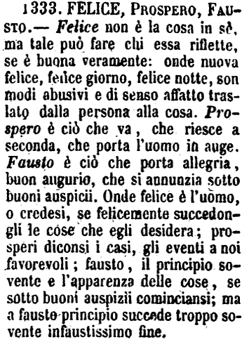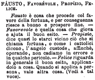 | Felice, Prospero, Fausto - Felice non è la cosa in sè, ma tale può fare chi essa riflette, se è buona veramente: onde nuova felice, felice giorno, felice notte, son modi abusivi e di senso affatto traslato dalla persona alla cosa. Prospero è ciò che va, che riesce a seconda, che porta l'uomo in auge. Fausto è ciò che porta allegria, buon augurio, che si annunzia sotto buoni auspicii. Onde felice è l'uomo, o credesi, se felicemente succedongli le cose che egli desidera; prosperi diconsi i casi, gli eventi a noi favorevoli; fausto, il principio sovente e l'apparenza delle cose, se sotto buoni auspizii cominciansi; ma a fausto principio succede troppo sovente infaustissimo fine. [immagine] |