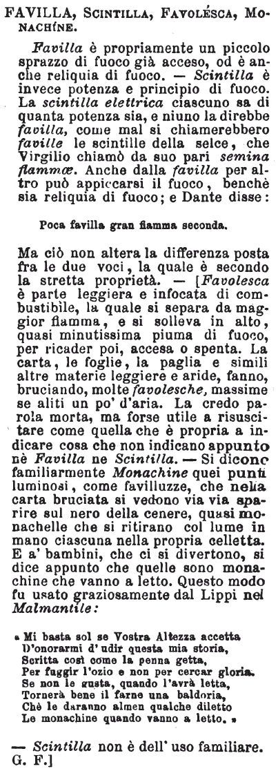 | Favilla, Scintilla, Favolesca, Monachine - Favilla è propriamente un piccolo sprazzo di fuoco già acceso, od è anche reliquia di fuoco. - Scintilla è invece potenza e principio di fuoco. La scintilla elettrica ciascuno sa di quanta potenza sia, e niuno la direbbe favilla, come mal si chiamerebbero faville le scintille della selce, che Virgilio chiamò da suo pari semina flammae. Anche dalla favilla per altro può appiccarsi il fuoco, benchè sia reliquia di fuoco; e Dante disse: