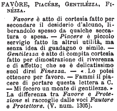 | Favore, Piacere, Gentilezza, Finezza - Favore è atto di cortesia fatto per secondare il desiderio d'alcuno, liberandolo spesso da qualche seccatura o spesa. - Piacere è piccolo servigio fatto in altrui utilità, ma senza idea di guadagno o simile. - Gentilezza è atto di compita cortesia fatto per dimostrazione di riverenza e di affetto; che se è delicatissimo suol dirsi Finezza. - «Lo potei ottenere per favore. - Fammi il piacere di portare questa lettera a C. - Mi fecero un monte di gentilezze.» La differenza tra Favore e Protezione si raccoglie dalle voci Fautore e Protettore. (V. num. 1305). [immagine] |