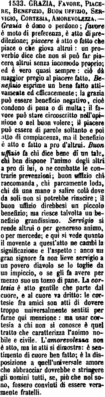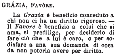 | Grazia, Favore - La Grazia è benefizio conceduto a chi non ci ha un diritto rigoroso. - Il Favore è benefizio a colui che si ama, si predilige, per desiderio di fare ciò che a lui è caro, o per sodisfare a una sua domanda di cosa da non poterla avere per diritto. [immagine] |