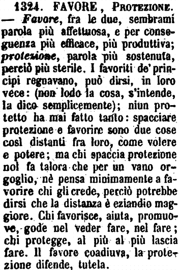 | Favore, Protezione - Favore, fra le due, sembrami parola più affettuosa, e per conseguenza più efficace, più produttiva; protezione, parola più sostenuta, perciò più sterile. I favoriti de' principi regnavano, può dirsi, in loro vece: (non lodo la cosa, s'intende, la dico semplicemente); niun protetto ha mai fatto tanto: spacciare protezione e favorire sono due cose così distanti fra loro, come volere e potere; ma chi spaccia protezione nol fa talora che per un vano orgoglio, nè pensa minimamente a favorire chi gli crede, perciò potrebbe dirsi che la distanza è eziandio maggiore. Chi favorisce, aiuta, promuove, gode nel veder fare, nel fare; chi protegge, al più al più lascia fare. Il favore coadiuva, la protezione difende, tutela. [immagine] |