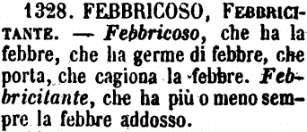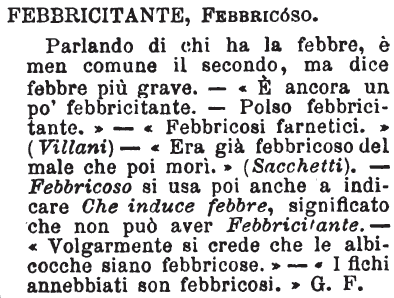 | Febbricitante, Febbricoso - Parlando di chi ha la febbre, è men comune il secondo, ma dice febbre più grave. - «E' ancora un po' febbricitante. - Polso febbricitante» - «Febbricosi farnetici.» (Villani) - «Era già febbricoso del male che poi morì.» (Sacchetti). - Febbricoso si usa poi anche a indicare Che induce febbre, significato che non può aver Febbricitante. - «Volgarmente si crede che le albicocche siano febbricose.» - «I fichi annebbiati son febbricosi.» G. F. [immagine] |