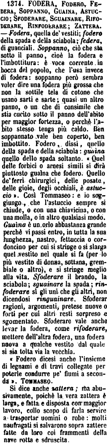 Fodera, Fodero, Federa, Soppanno, Guaina, Astuccio; Sfoderare, Sguainare, Rifoderare, Rinfoderare; Zattera - Fodera, quella de' vestiti; fodero della spada e della sciabola; federa, di guanciali. Soppanno, ciò che sta sotto il panno, cioè la fodera e l'imbottitura: è voce corrente in bocca del popolo, che l'usa invece di fodera: soppanno però sembra voler dire una fodera più grossa che non la sottile tela di cotone che usano sarti e sarte; quasi un altro panno, o un che di consimile che stia cucito sotto il panno dell'abito per maggior fortezza, o perchè l'abito stesso tenga più caldo. Ben soppannato vale ben coperto, ben imbottito. Fodero, dissi, quello della spada e della sciabola: guaìna quello dello spada soltanto. « Quel delle forbici o arnesi simili si dirà piuttosto guaìna che fodero. Quello de' ferri chirurgici, delle posate, delle gioie, degli occhiali, è astuccio ». Così Tommaseo: e io soggiungo, che l'astuccio sempre si chiude, o con una chiavicina, o con una molla, o in altro qualsiasi modo. Guaìna è un orlo abbastanza grande perchè vi passi entro, in tutta la sua lunghezza, nastro, fettuccia o cordoncino per cui si stringe o si slarga quel vestito nel quale si fa (per lo più vestito di donna, sottana, grembiale o altro), e si stringe meglio alla vita. Sfoderare il brando, la sciabola; sguainare la spada; rinfoderare sì gli uni che gli altri, non dicendosi ringuainare. Sfoderar ragioni, argomenti, pretese nuove o forti per cui altri resti sorpreso e sgomentato. Sfoderare vale anche levar la fodera, come rifoderare, mettere dell'altra fodera, una fodera nuova a qualche vestito dal quale si sia tolta via la vecchia.