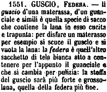 | Guscio, Federa - Il guscio d'una materassa, d'un guanciale e simili è quella specie di sacco che contiene la lana in esso cucita e trapunta: per disfare un materasso per esempio si scuce il guscio e si vuota la lana: la federa è quell'altro sacchetto di tela bianca atto a contenere per l'appunto il guanciale e che si cambia per pulizia: la stoffa del guscio sarà più forte e grossolana, quella della federa più fine. [immagine] |