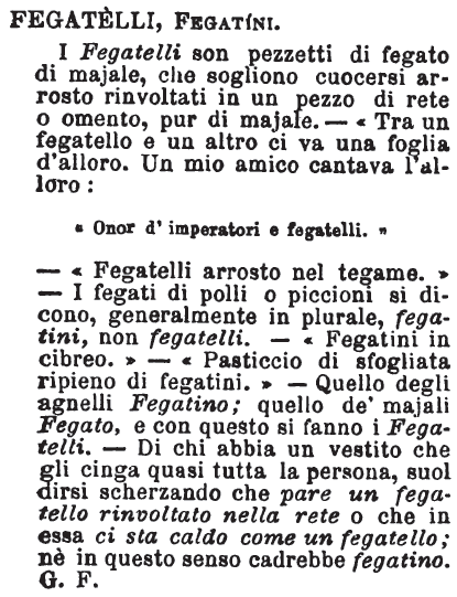| Fegatelli, Fegatini - I Fegatelli son pezzetti di fegato di majale, che sogliono cuocersi arrosto rinvoltati in un pezzo di rete o omento, pur di majale. - «Tra un fegatello e un altro ci va una foglia d'alloro. Un mio amico cantava l'alloro: