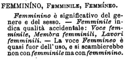 | Femminino, Femminile, Femmineo - Femminino è significativo del genere e del sesso. - Femminile indica qualità accidentale: Voce femminile, Membra Femminili, Lavori Femminili. - La voce Femmineo è quasi fuor dell'uso, e si scambierebbe non con femminile ma con femminino. [immagine] |