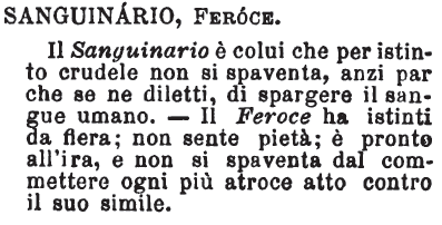 | Sanguinario, Feroce - Il Sanguinario è colui che per istinto crudele non si spaventa, anzi par che se ne diletti, di spargere il sangue umano. - Il Feroce ha istinti da fiera; non sente pietà; è pronto all'ira, e non si spaventa dal commettere ogni più atroce atto contro il suo simile. [immagine] |