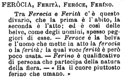 | Ferocia, Ferita, Feroce, Ferino - Tra Ferocia e Ferità c'è questo divario, che la prima è l'abito, la seconda è l'atto; ed è così delle belve, come degli uomini, spesso peggiori di esse. - Feroce è la belva e l'uomo che mette in atto la ferocia o la ferità; la qual voce ferità è però poco usata. - Ferino è qualificativo di persona che partecipa della natura della fiera. - «Ha il cuore piuttosto ferino che umano.» [immagine] |