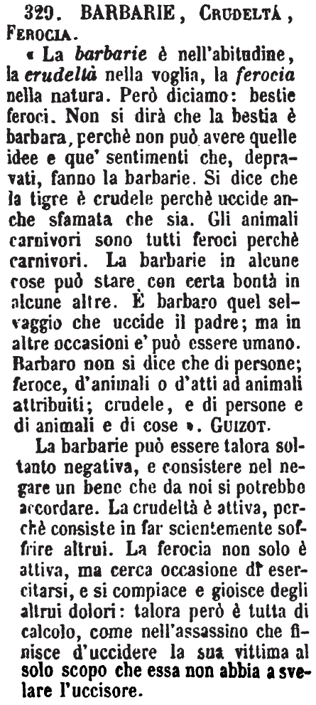 | Barbarie, Crudeltà, Ferocia - «La barbarie è nell’abitudine, la crudeltà nella voglia, la ferocia nella natura. Però diciamo: bestie feroci. Non si dirà che la bestia è barbara, perchè non può avere quelle idee e que’ sentimenti che, depravati, fanno le barbarie. Si dice che la tigre è crudele perchè uccide anche sfamata che sia. Gli animali carnivori sono tutti feroci perchè carnivori. La barbarie in alcune cose può stare con certa bontà in alcune altre. È barbaro quel selvaggio che uccide il padre; ma in altre occasioni e’ può essere umano. Barbaro non si dice che di persone; feroce, d’animali o d’atti ad animali attribuiti; crudele, e di persone e di animali e di cose». Guizot.