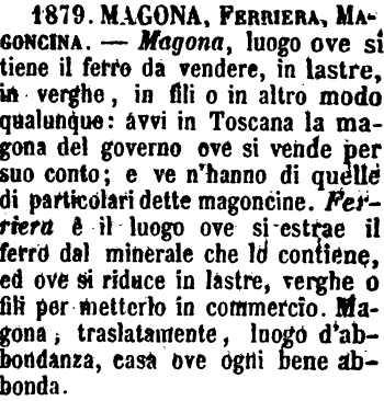 | Ferriera, Magona - In qualche antico scrittore si trovano confuse, e anche oggi si confondono da' non toscani; ma da' più accurati scrittori, come anc'oggi da' ben parlanti in Toscana, si distinguono l'una dall'altra. - Nella ferriera il ferro si lavora; nella magona si tiene in deposito e si vende. Dalla ferriera viene il ferro lavorato alle magone, le quali, se piccole, o quasi succursali ad altre più grandi, si dicono magoncine. G. F. [immagine] |