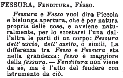 | Fessura, Fenditura, Fesso - Fessura e Fesso vuol dire Piccola e bislunga apertura, che è per natura propria delle cose, e avviene naturalmente, per lo scostarsi l'una dall'altra le parti di un corpo: Fessura dell'uscio, dell'assito, o simili. La differenza tra Fesso e Fessura sta nella grandezza: fesso è maggiore della fessura. - Fenditura non viene da sè, ma è l'atto del fendere con istrumento da ciò. [immagine] |