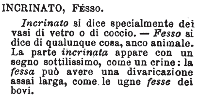 | Incrinato, Fesso - Incrinato si dice specialmente dei vasi di vetro o di coccio. - Fesso si dice di qualunque cosa, anco animale. La parte incrinata appare con un segno sottilissimo, come un crine: la fessa può avere una divaricazione assai larga, come le ugne fesse dei bovi. [immagine] |