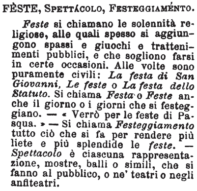 | Feste, Spettacolo, Festeggiamento - Feste si chiamano le solennità religiose, alle quali spesso si aggiungono spassi e giuochi e trattenimenti pubblici, e che sogliono farsi in certe occasioni. Alle volte sono puramente civili: La festa di San Giovanni, Le feste o La Festa dello Statuto. Si chiama Festa o Feste anche il giorno o i giorni che si festeggiano. - « Verrò per le feste di Pasqua. » - Si chiama Festeggiamento tutto ciò che si fa per rendere più liete e più splendide le feste. - Spettacolo è ciascuna rappresentazione, mostre, balli o simili, che si fanno al pubblico, o ne' teatri o negli anfiteatri. [immagine] |