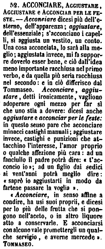 Acconciare, aggiustare, detti ironicamente, vagliono adoperare ogni mezzo per far sì che uno stia a dovere: dicesi anche aggiustare e acconciar per le feste: in questo senso pare che acconciare minacci castighi manuali; aggiustare invece, castighi e punizioni che attacchino l'interesse, l'amor proprio o qualche affezione più cara: ad un fanciullo il padre potrà dire: «t'acconcio io»; ad un figlio dai sedici ai vent'anni potrà meglio dire: «saprò io aggiustarti in modo da fartene passare la voglia».