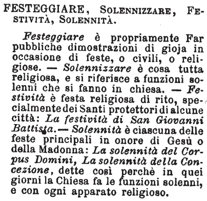 | Festeggiare, Solennizzare, Festività, Solennità - Festeggiare è propriamente Far pubbliche dimostrazioni di gioja in occasione di feste, o civili, o religiose. - Solennizzare è cosa tutta religiosa, e si riferisce a funzioni solenni che si fanno in chiesa. - Festività è festa religiosa di rito, specialmente dei Santi protettori di alcune città: La festività di San Giovanni Battista. - Solennità è ciascuna delle feste principali in onore di Gesù o della Madonna: La solennità del Corpus Domini, La solennità della Concezione, dette così perchè in quei giorni la Chiesa fa le funzioni solenni, e con ogni apparato religioso. [immagine] |