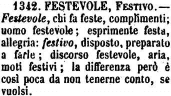 | Festevole, Festivo - Festevole, chi fa feste, complimenti; uomo festevole; esprimente festa, allegria: festivo, disposto, preparato a farle; discorso festevole, aria, moti festivi; la differenza però è così poca da non tenerne conto, se vuolsi. [immagine] |