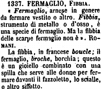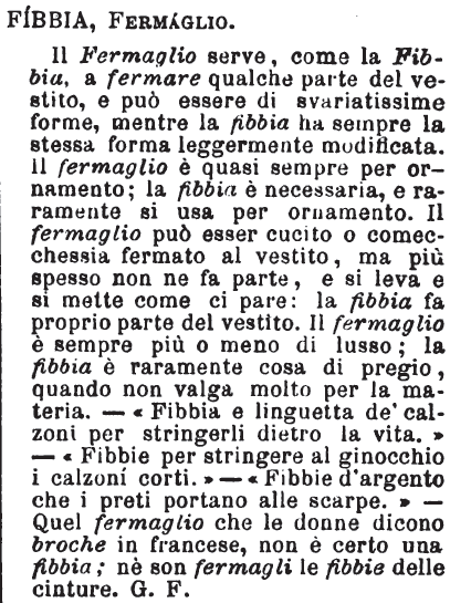 | Fermaglio, Fibbia - «Fermaglio, arnese in genere da fermare vestito o altro. Fibbia, strumento di metallo o d'osso, è una specie di fermaglio. Ma la fibbia delle scarpe fermaglio non è». Romani.