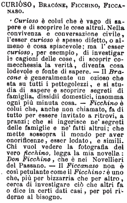 | Curioso, Bracone, Ficchino, Ficcanaso - Curioso è colui che è vago di sapere e di scoprire le cose altrui. Nella convivenza e conversazione civile, l'esser curioso è spesso difetto, o almeno è cosa spiacevole; ma l'esser curioso, per esempio, di investigar le cagioni delle cose, di scoprir comecchessia la verità, diventa cosa lodevole e fonte di sapere. - Il Bracone è generalmente un ozioso che sta su tutti i pettegolezzi, e si studia di sapere e scoprire segreti di famiglia, dissidii domestici, insomma ogni più minuta cosa. - Ficchino è colui che, anche non chiamato, fa di tutto per essere invitato a ritrovi, a pranzi; che si ingerisce ne' segreti delle famiglie e ne' fatti altrui; che mette sossopra il mondo per aver onorificenze, esser lodato, e simili. Chi vuol vedere la fotografia del vero ficchino, legga la mia novella: Don Ficchino, che è nei Novellieri del Passano. - Il Ficcanaso non è così petulante come il Ficchino: è uno che, più per bizzarria che per altro, cerca di investigare ciò che altri fa o dice in certi dati casi, per poi riderne al bisogno. [immagine] |