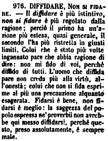 | Diffidare, Non si fidare - Il diffidare è più istintivo, non si fidare è più regolato dalla ragione; perciò il primo ha un'azione più estesa, quasi generale, il secondo l'ha più ristretta in giusti limiti. Colui che è stato più volte ingannato pare che abbia ragione di dire: non mi fido di voi, perchè diffido di tutti. L'uomo che diffida pare non creda più alla virtù, all'onestà; colui che non si fida esprime al più una precauzione alquanto esagerata. Fidarsi è bene, non fidarsi è meglio: la saggezza del popolo espressa ne' proverbii non avrebbe qui messo diffidarsi, perchè questo, preso assolutamente, è sempre male. [immagine] |