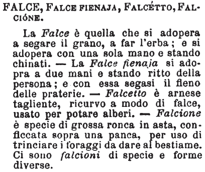| Falce, Falce fienaja, Falcetto, Falcione - La Falce è quella che si adopera a segare il grano, a far l'erba; e si adopera con una sola mano e stando chinati. - La Falce fienaja si adopra a due mani e stando ritto della persona; e con essa segasi il fieno delle praterie. - Falcetto è arnese tagliente, ricurvo a modo di falce, usato per potare alberi. - Falcione è specie di grossa ronca in asta, conficcata sopra una panca, per uso di trinciare i foraggi da dare al bestiame. Ci sono falcioni di specie e forme diverse. [immagine] |