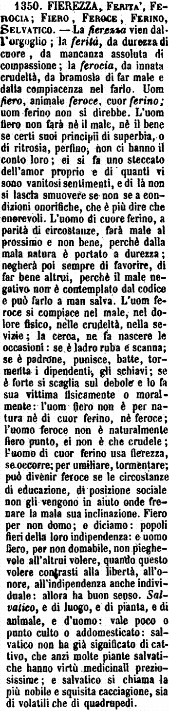 | Fierezza, Ferità, Ferocia; Fiero, Feroce, Ferino, Selvatico - La fierezza vien dall'orgoglio; la ferità, da durezza di cuore, da mancanza assoluta di compassione; la ferocia, da innata crudeltà, da bramosìa di far male e dalla compiacenza nel farlo. Uom fiero, animale feroce, cuor ferino; uom ferino non si direbbe. L'uom fiero non farà nè il male, nè il bene se certi suoi principii di superbia, o di ritrosia, perfino, non ci hanno il conto loro; ei si fa uno steccato dell'amor proprio e di quanti vi sono vanitosi sentimenti, e di là non si lascia smuovere se non se a condizioni onorifiche, che è più dire che onorevoli. L'uomo di cuore ferino, a parità di circostanze, farà male al prossimo e non bene, perchè dalla mala natura è portato a durezza; negherà poi sempre di favorire, di far bene altrui, perchè il male negativo non è contemplato dal codice e può farlo a man salva. L'uom feroce si compiace nel male, nel dolore fisico, nelle crudeltà, nella sevizie; la cerca, ne fa nascere le occasioni: se è ladro ruba e scanna; se è padrone, punisce, batte, tormenta i dipendenti, gli schiavi; se è forte si scaglia sul debole e lo fa sua vittima fisicamente o moralmente: l'uom fiero non è per natura nè di cuor ferino, nè feroce; l'uomo feroce non è naturalmente fiero punto, ei non è che crudele; l'uomo di cuor ferino usa fierezza, se occorre; per umiliare, tormentare; può divenir feroce se le circostanze di educazione, di posizione sociale non gli vengono in aiuto onde frenare la mala sua inclinazione. Fiero per non domo; e diciamo: popoli fieri della loro indipendenza: e uomo fiero, per non domabile, non pieghevole all'altrui volere, quando questo volere contrasti alla libertà, all'onore, all'indipendenza anche individuale: allora ha buon senso. Salvatico, e di luogo, e di pianta, e di animale, e d'uomo: vale poco o punto culto o addomesticato: salvatico non ha già significato di cattivo, che anzi molte piante salvatiche hanno virtù medicinali preziosissime; e salvatico si chiama la più nobile e squisita cacciagione, sia di volatili che di quadrupedi. [immagine] |