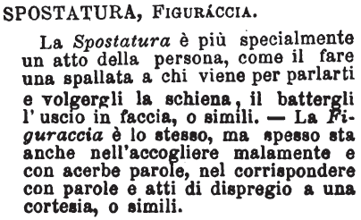 | Spostatura, Figuraccia - La Spostatura è più specialmente un atto della persona, come il fare una spallata a chi viene per parlarti e volgergli la schiena, il battergli l'uscio in faccia, o simili. - La Figuraccia è lo stesso, ma spesso sta anche nell'accogliere malamente e con acerbe parole, nel corrispondere con parole e atti di dispregio a una cortesia, o simili. [immagine] |
