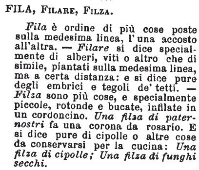 | Fila, Filare, Filza - Fila è ordine di più cose poste sulla medesima linea, l'una accosto all'altra. - Filare si dice specialmente di alberi, viti o altro che di simile, piantati sulla medesima linea, ma a certa distanza: e si dice pure degli embrici e tegoli de' tetti. - Filza sono più cose, e specialmente piccole, rotonde e bucate, infilate in un cordoncino. Una filza di paternostri fa una corona da rosario. E si dice pure di cipolle o altre cose da conservarsi per la cucina: Una filza di cipolle; Una filza di funghi secchi. [immagine] |