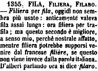 | Fila, Filiera, Filaro - Filiera per fila, oggidì non sembra più usato: anticamente valeva fila assai lunga: ora filiera per trafila; ma questo secondo è migliore, a senso mio, perchè nostrale affatto, mentre filiera potrebbe supporsi venire dal francese filière, se questo non viene invece dalla parola italiana. D'alberi parlando ora si dice filaro. [immagine] |